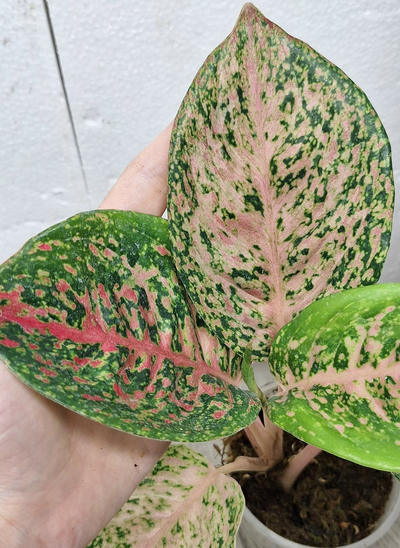 как на фото, в стакане. Название на русском: Аглаонема 10 Карат зелено-черный.