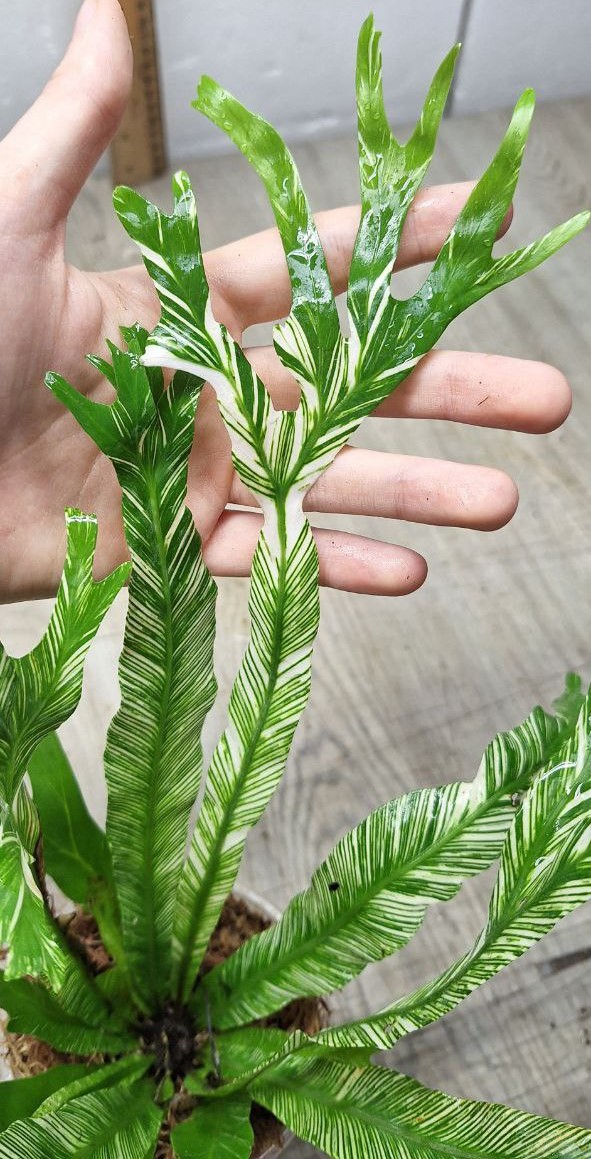 Как на фото, в горшке. Название на русском: Асплениум нидус варегатная Япония.