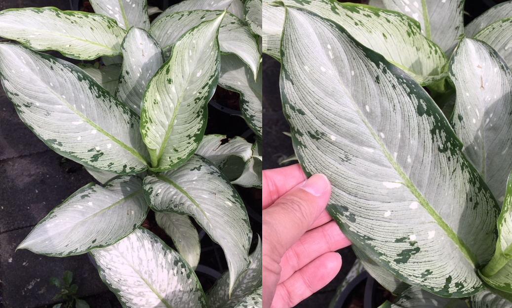 Как на фото, в пакете. Название на русском: Диеффенбахия Удомсаб (Серебряная форма)