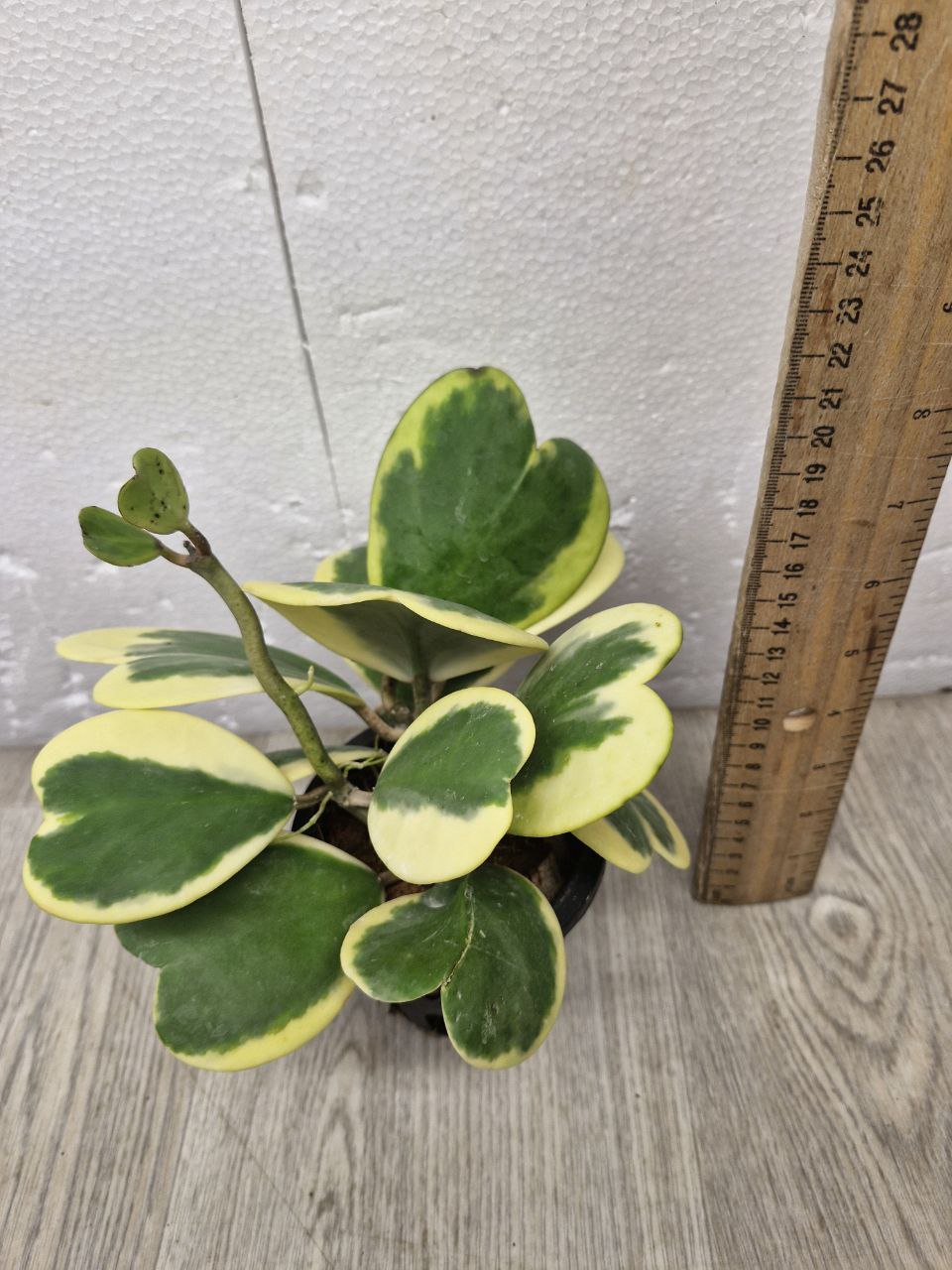 Листья плотные с пестрым окрасом, у которых по краям проходит светло-кремовая или белая кайма. , мясистые, глянцевые, в форме сердца — из-за этого растение часто называют "валентинка" или "Хойя-сердечко".