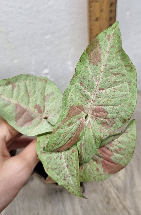 как на фото, в стакане. Название на русском: Сингониум Пинк Спот ('Pink Spot' - с англ. "Розовые Пятна")