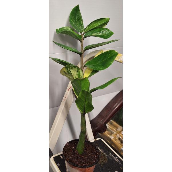 как на фото, в горшке. Название на русском: Замиокулкас замифлдия варегатная (короткий лист)