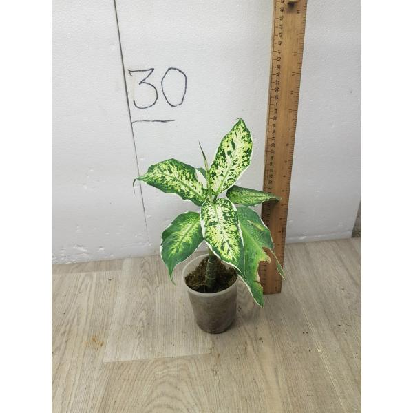 как на фото, в стакане. Название на русском: Аглаонема Сетхи руб мани (Диффенбахия)