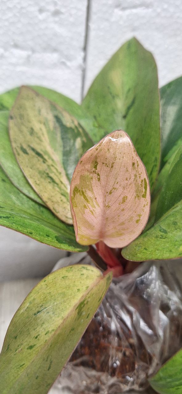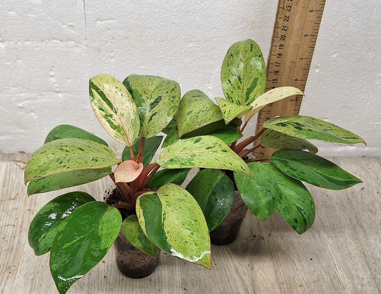 как на фото, в стакане. Название на русском: Филодендрон Конго карлик варегатный