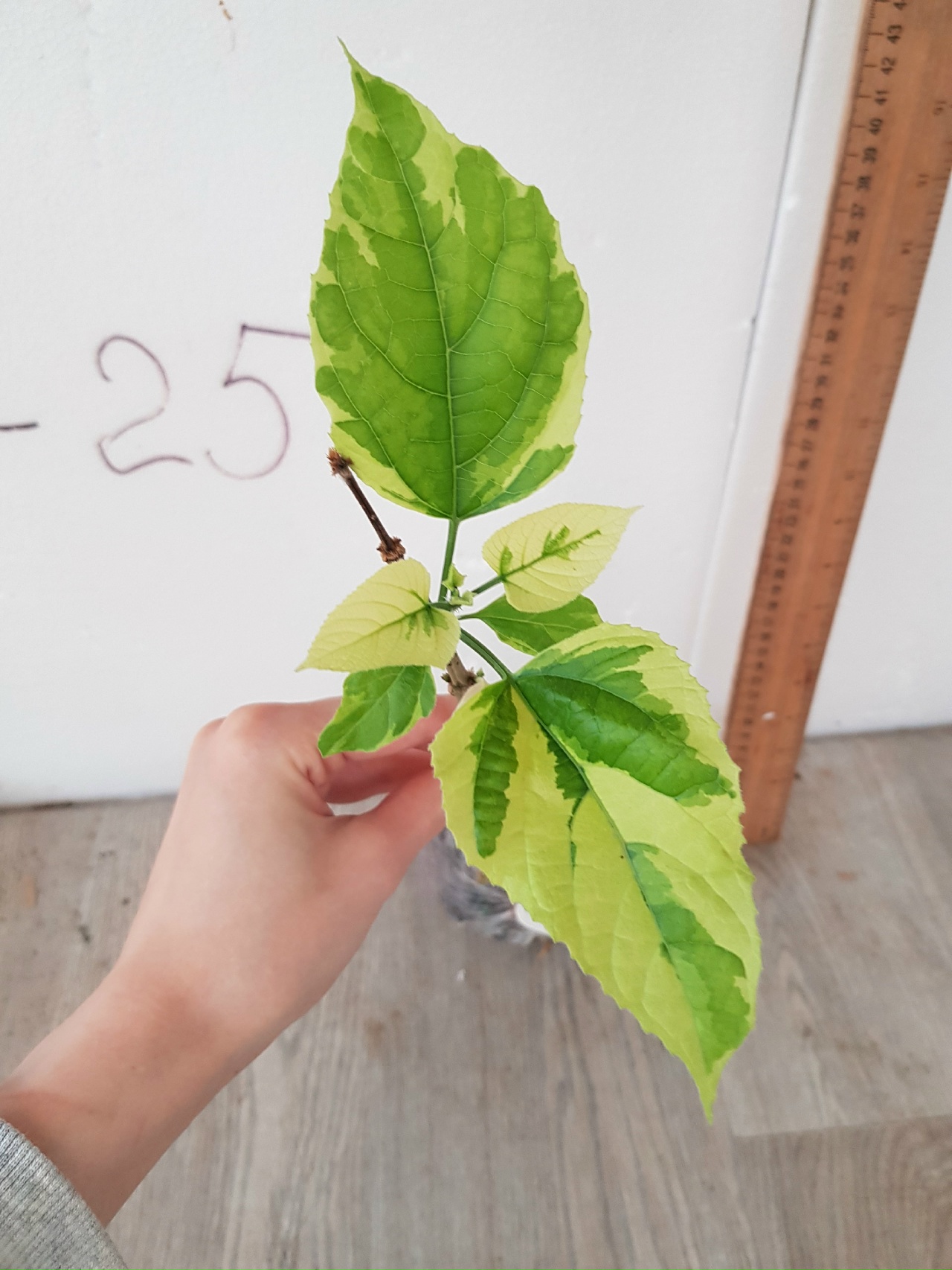 Как на фото, в пакете. Название на русском: Клеродендрум паникулатум варегатный.
