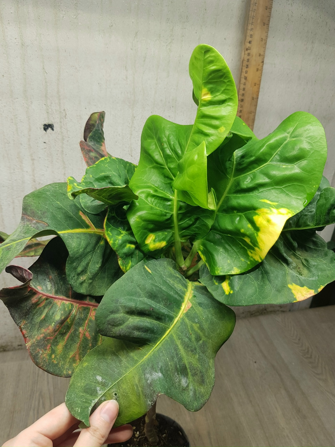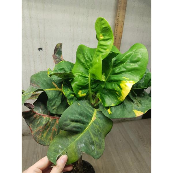 как на фото, в горшке. Название на русском: Кодиеум Матчаван