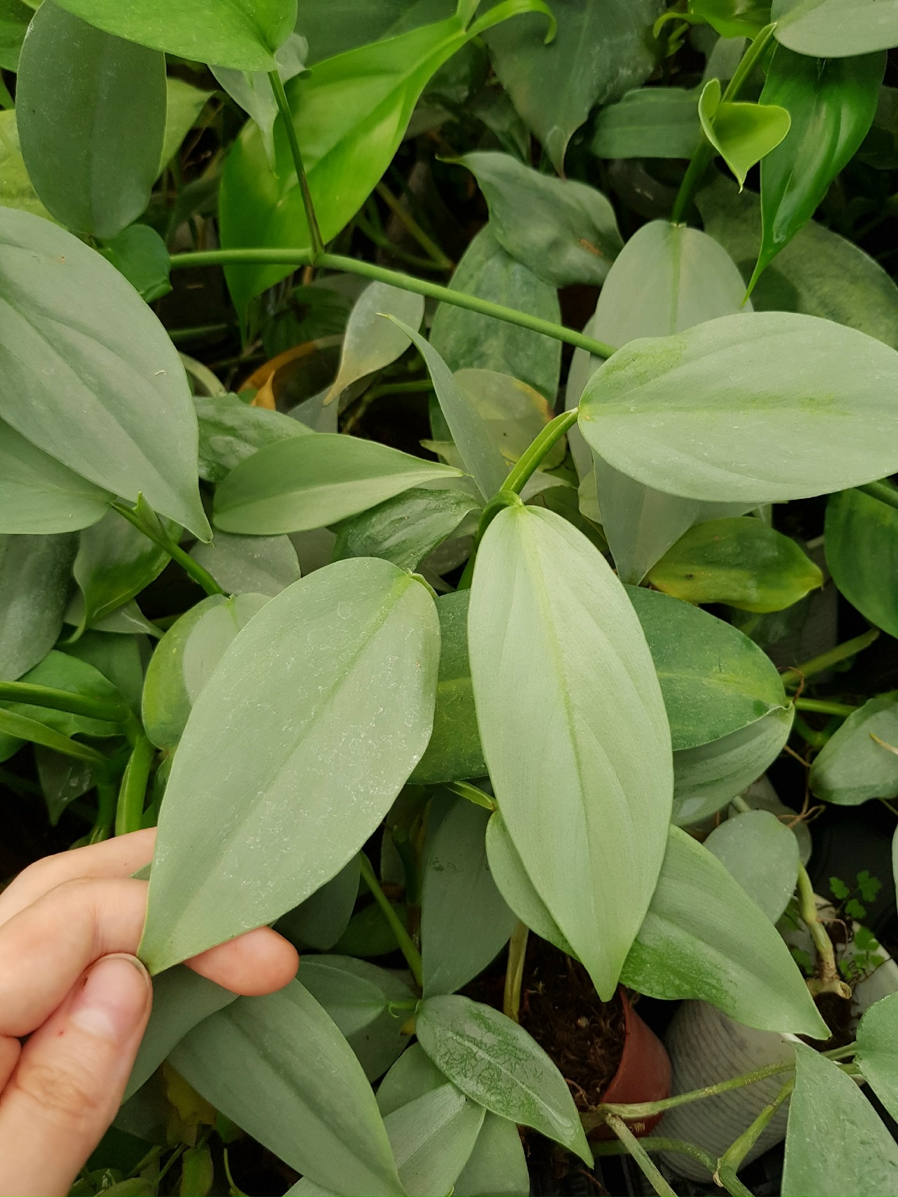 Как на фото, в стакане. Название на русском: Филодендрон Сильвер Квин