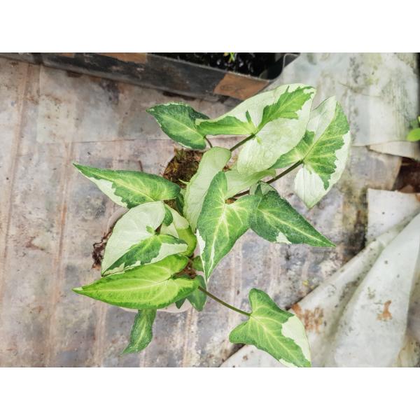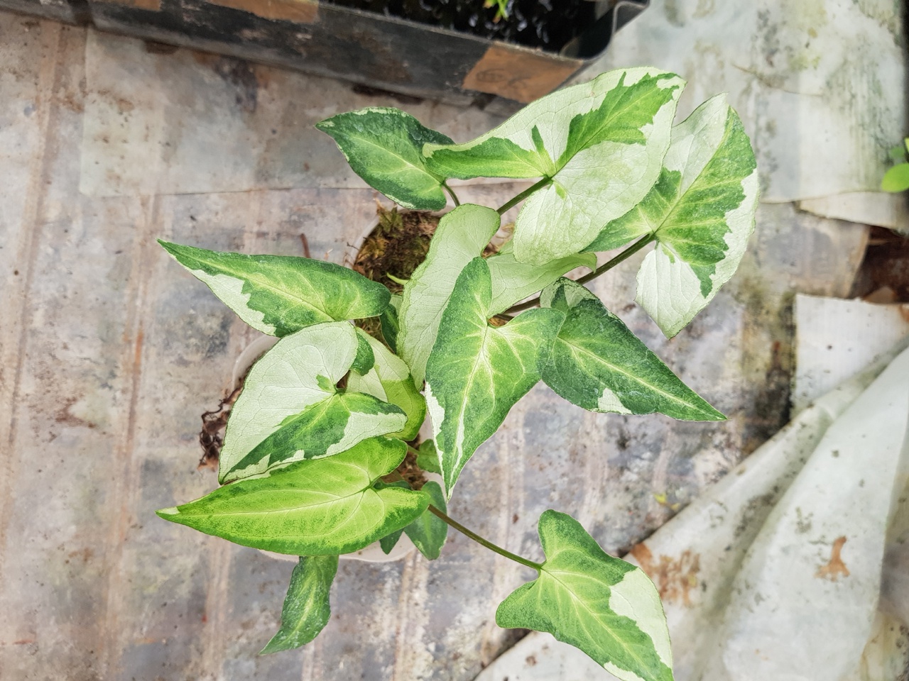 как на фото, в горшке. Название на русском: Сингониум Три Короля