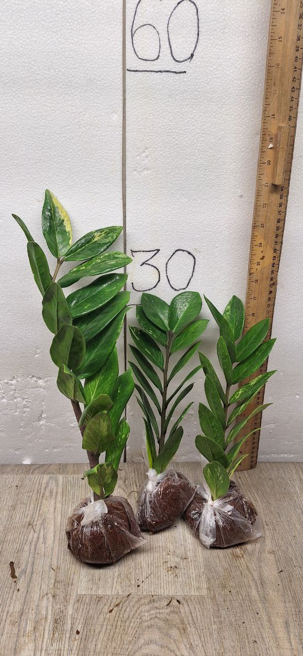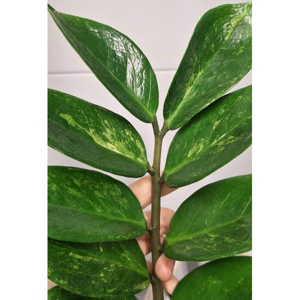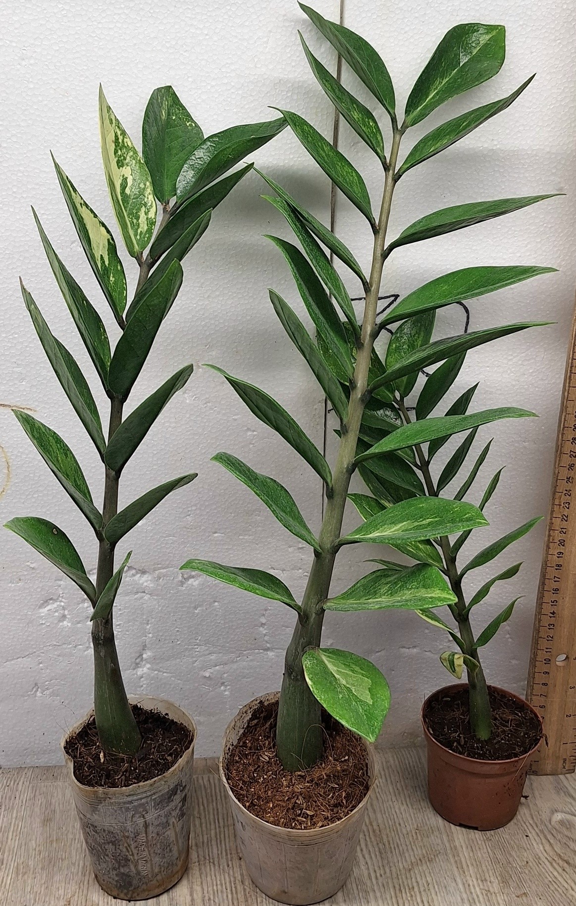 как на фото, в горшке. Название на русском: Замиокулкас замифлдия варегатная (короткий лист)