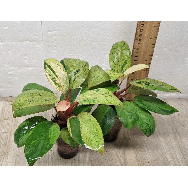 как на фото, в стакане. Название на русском: Филодендрон Конго карлик варегатный